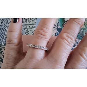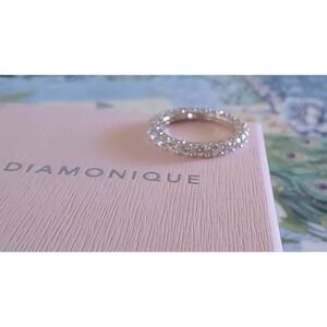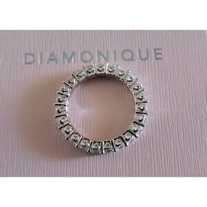 This gorgeous eternity style band ring features 4 carats of shimmering round cut DIAMONIQUE stones that are set and sparkle all the way around the diameter of the band. The top and bottom gallery of the band has little heart cut outs at each setting for a unique and elegant look and feel. The smooth prongs ensure a safe and comfortable fit. The setting and band are done in .925 solid sterling silver and is stamped for authenticity. It is plated with pure platinum for a lifetime of sparkle and durability. It is size 8. This stunner will give you the “big money “ look without having to shell out the big money. Comes in a white velvet gift pouch and pink Diamonique gift box.