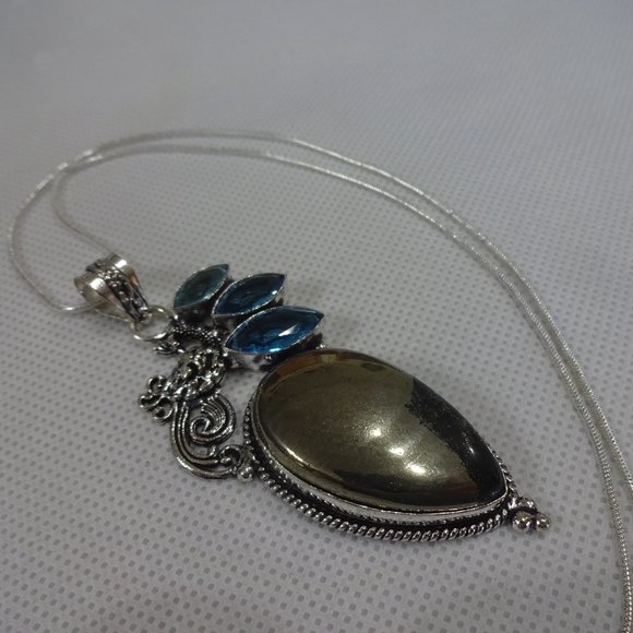 Stunning "APACHE PYRITE & BLUE TOPAZ" Handmade Sterling Necklace/Chain #481A