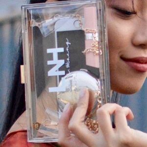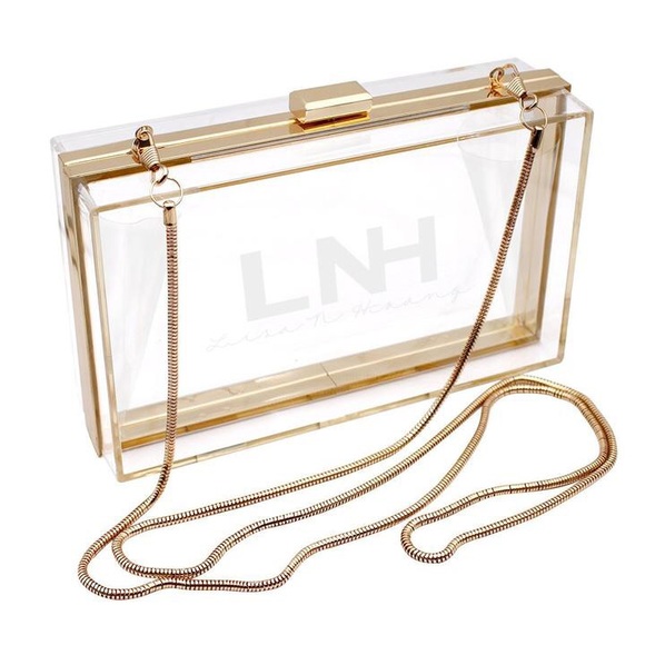 With the LNH logo screen printed in this beautiful acrylic clutch with gold detailing. There is a gold chain (3rd and 4th pic) inside to make it a shoulder or crossbody.