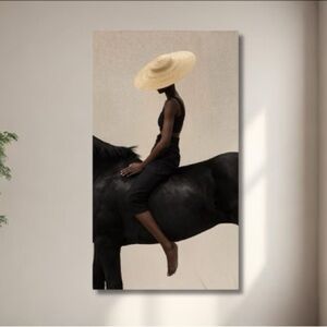 Transform your space with this captivating equestrian canvas art, featuring a graceful figure on horseback. The silhouette of the poised rider, adorned with a chic sun hat, against the majestic backdrop of a glossy black horse offers a striking contrast that exudes sophistication. This piece is perfect for adding an air of elegance to any room. Ideal for the equestrian enthusiast or anyone who appreciates the fusion of modern art with classic beauty. Bring this serene and stylish scene into your home and let it elevate your interior design.