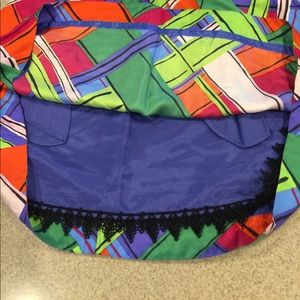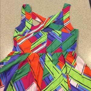 Love the colors and cut of this very flattering dress. Has pockets and snaps to keep your bras straps hidden. Perfect for holidays, weddings, showers, vacation, anywhere! I love this dress, if it still fit I would not be selling. Stored safely, in gray shape, just needs a little pressing.