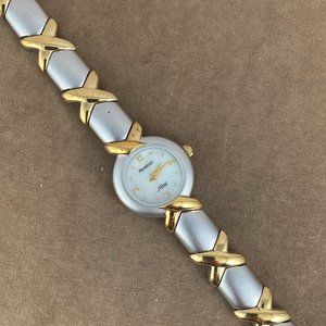 Stunning Armitron Now 2 Tone X Bar Bracelet with a 3/4 Diameter Watch 7.75 inch in length with Double Link Clasp Mineral Crystal Mother Pearl Dial Gold Hands Roman Numerals and Raised Markers New Battery watch was a salesman sample almost like new great first watch graduation birthday