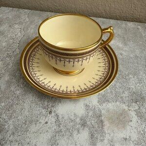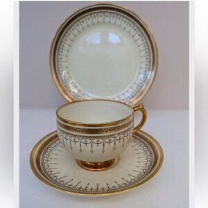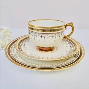 A rare vintage tea trio in a lovely art deco style and shape and the pattern number is 9608. Exquisitely hand decorated with an elegant gold design on a creamy yellow background. The china is very fine and almost translucent in the sunshine. The cup is a lovely round shape with a heavily gilded foot.