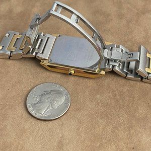 Stunning Art Deco Tank Regal Watch by Designer Daniel Steiger 18 Karat Gold Plated and Stainless Steel Watch with 28 real Diamonds Screw in Stainless Steel Bach 6.5 inch link bracelet Guilloche Enamel face Sapphire Crystal Roman Numerals Blued Hands and Black Accents and Numbers with date Case is 1.25x1 inch plus Onyx Crown. The watch has a registered number DS2004 New Battery Serviced 072 Swiss Movement Top High End Designer Watch UNISEX