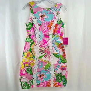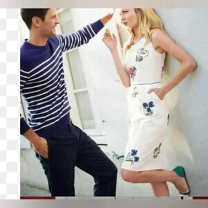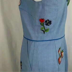 Embroidered flowers | veggies | fruit woven crosshatch piping trim around neckline & waist Sheath Style