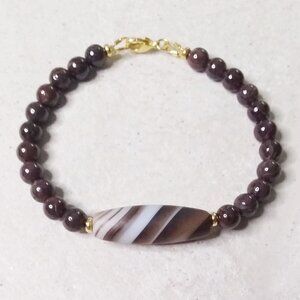 The focal piece is a gorgeously banded brown Agate Drum Bead - matched up with rich coffee bean brown Jasper beads. The gold spacers are 18K gold plated brass. This bracelet comfortably fits a 7" wrist and securely closes with a lobster claw clasp.