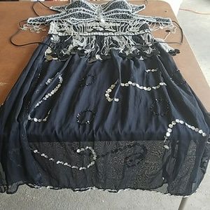 What a pretty outfit! This is a S/M Belly dance outfit. Very sparkly and with a lot of intricate bead design