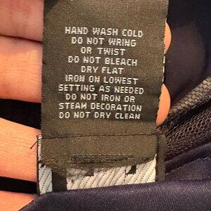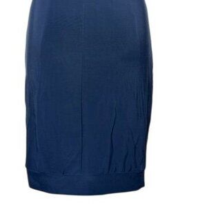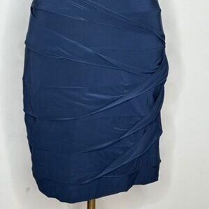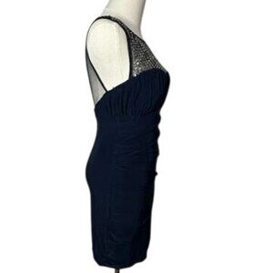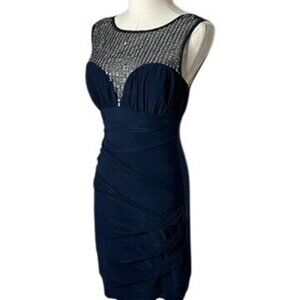 This elegant navy dress features a rhinestone-embellished mesh upper and ruched details for a sophisticated look. Its back keyhole design adds a stylish touch.
