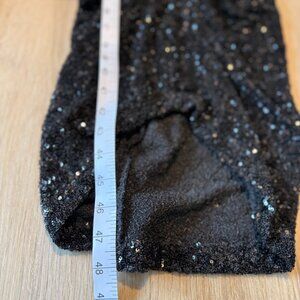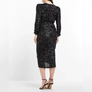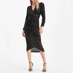 Turn heads in this elegant black sequin dress from Express featuring a flattering V-neckline, long sleeves, and ruched detailing down the front for a sleek silhouette. Perfect for cocktail parties, holiday events, or formal occasions.