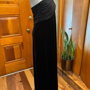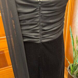 Elegant and classy. Gathered bodice is a scarf like material and the skirt is a black velvet that has some stretch to it. This is a very flattering gown and is well made. Perfect for your special occasion. Worn once, it has been cleaned and is in excellent condition. Size 12.
