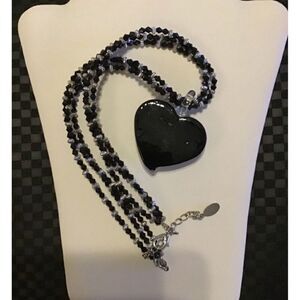 A 1.5” diameter black heart pendant is fashioned with hand blown glass and hand painted in an abstract pattern of silver, black and gold. The pendant hangs on an 18” triple strand of black Swarovski crystals and silver filigree ball caps. It has a 3” chain extender and lobster claw clasp closure. The matching black round disc earrings are 1.25” in length and have French ear wire closures.