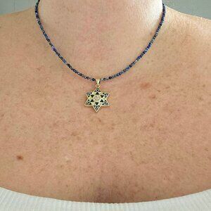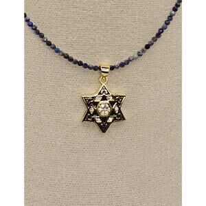 Description: This stunning Star of David necklace features a gold-plated charm with intricate blue enamel inlay, dotted with sparkling cubic zirconia for a radiant effect. The handmade chain is crafted with genuine Lapis Lazuli beads, known for their deep blue hues and historical significance. Measuring 16 inches with a 2-inch extender, this necklace is the perfect blend of elegance and symbolism, making it an ideal gift for Jewish holidays or special occasions.