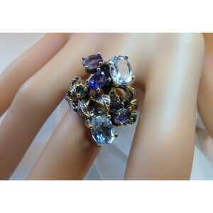 Stunning Blue Topaz- Iolite Sterling Silver Ring Botanical Vines Size 8 Cocktail