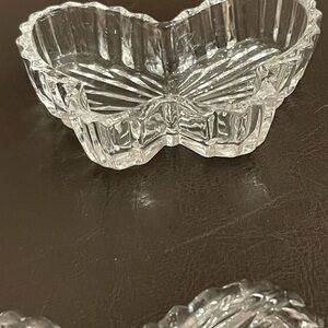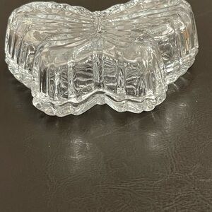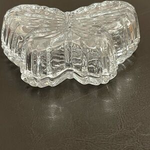 This is a stunning butterfly-shaped cut crystal glass trinket dish with a lid. The dish is made of clear glass in a modern style. It is an original piece and its age is unknown.