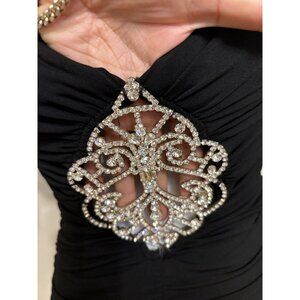 Stunning stretch chiffon evening gown with flared and flowy double layered chiffon bottom. Sweetheart neckline and light padding at bust with silicon strip to hold dress in place. Beautiful embellished rhinestone piece at front that acts like a semi sheer cutout under the bust. Ruching throughout front and back. Adjustable tie back with long chiffon tie. Hidden zipper closure. Has stretch. Super figure flattering. Very unique and perfect for any special occasion!