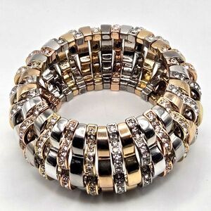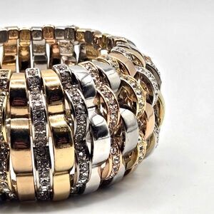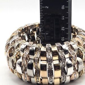 Stunning Chunky Heavy Tri-Tone Wide Stretch Bracelet with Rhinestone Pave Spacer