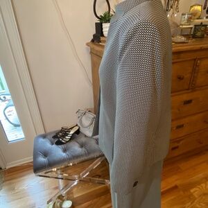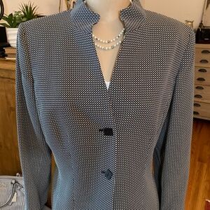 This is a flattering, beautiful suit! Form fitting and perfect for work, interview, presentation on stage, etc. The look is classic Kasper and the suit is very clean. Size 10 for skirt and jacket, but I'm an 8 and this fits me with a LITTLE room to breathe. (5'6" in height - 135 pds)