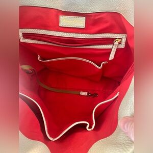 Elegant Longchamp tote with cream leather exterior. Vibrant red interior. Includes multiple pockets for easy organization.
