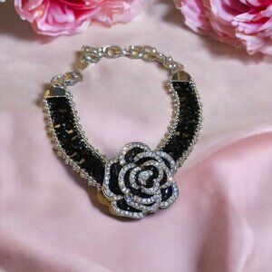 Beautifully crafted. Two rows of black crystals trimmed with silver highlighted with a glittering 1 inchcrystal Camellia flower as the centerpiece . Crafted from durable stainless steel and crystals, it measures 7.5 inch with a 2 inch extender chain, making it perfect for weddings, parties, and stylish gatherings. Formal, prom, bridal, parties, New Years. See also the matching necklace.