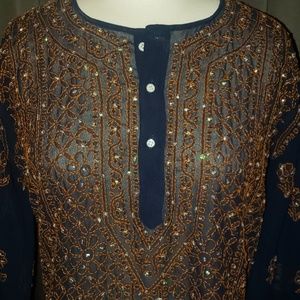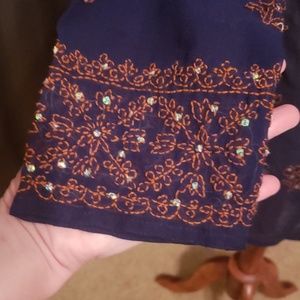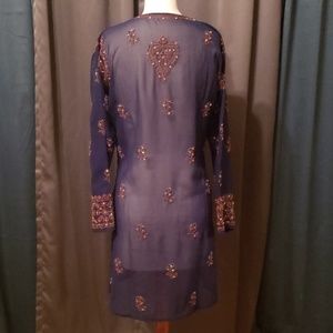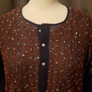 Sheer navy fabric with burnt orange hand stitching and iridescent sequins. Meant to be loose fitting and is approximately a size medium. See below.