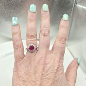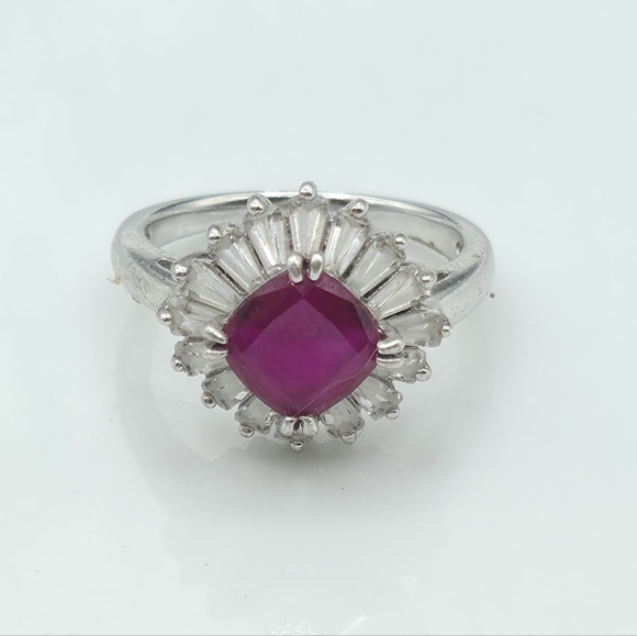 This designer signed ring features a center cushion cut gorgeous Ruby encased in a Halo of trapezoid cut white sparkling quartz set in rhodium coated solid 925 sterling silver!