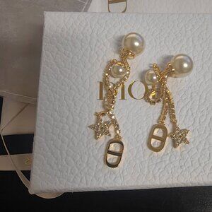 Beautiful Dior Tribales earrings featuring pearls, gold-tone details, subtle rhinestones, and the iconic CD logo. Elegant, timeless, and ultra-feminine!