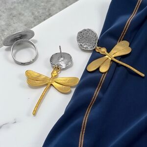 ๐๏ธStunning Dragonfly Turkish 24K Gold Plated Earrings And Ring Artisan Set