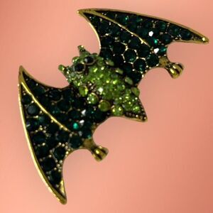 This Halloween pin or brooch is a unique and eye-catching accessory that is sure to make a statement. The pin features a flying bat design that is adorned with rhinestones, adding a touch of glamour and sparkle to the overall look.
