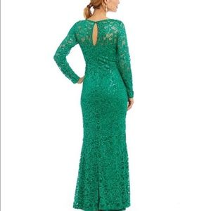 Stunning Emerald Green Lace Overlay Marina Gown with Sequins. Size: 6 Length is 56" from shoulder to hem. Exquisite detailing and quality. Back of dress and Sheer Lace top give the dress a very sophisticated flare. Dress is extremely comfortable and very flattering. Anniversary Dress that has literally only been worn once and only because I have not had another occassion to do so. Reasonable offers only please.