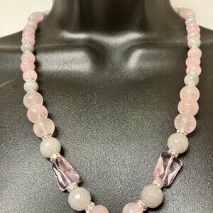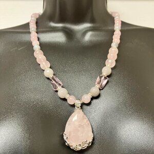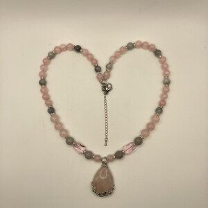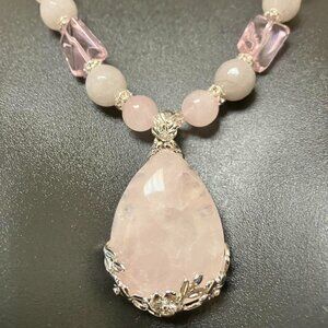 Handmade Genuine Rose Quartz Gemstone Teardrop Pendant with matching smaller gemstones - All genuine beads (10 and 8mm), plus Gray Jade beads, Crystal (2) and cubic zirconia spacers to catch the light with every turn.