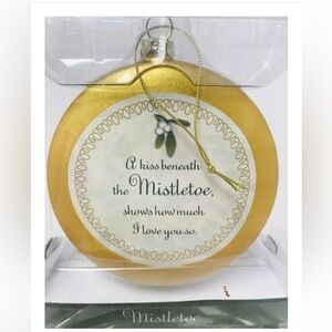 Beautiful glass disc ornament with loose gold flakes. Mistletoe image and message on the back. Fantastic gift. 4 inch disc.