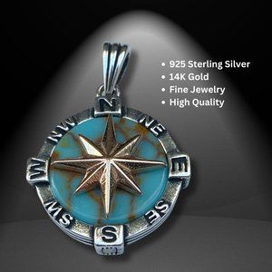 Stunning Gold Northstar Compass Pendant w/ Turquoise Accent - Unisex 925 Sterlin