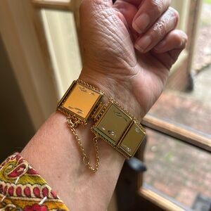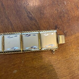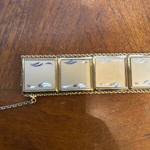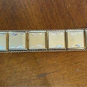 Elegant gold tone mesh panel bracelet with silver accents. Perfect for everyday wear and special occasions. 7 inches long by 1 inch wide.
