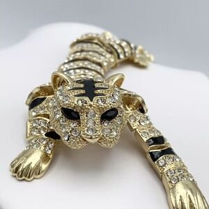 Elegant gold and black tiger brooch with sparkling details. Perfect for adding a touch of luxury to any outfit.