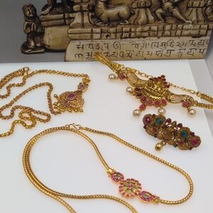 Details are below. Embrace timeless elegance and cultural richness with this exquisite lot of traditional Indian-inspired jewelry. Each piece in this collection is in excellent condition, radiating a refined, aesthetically pleasing charm. Perfect for festive occasions, weddings, or adding a touch of popular classic style to your ensemble.