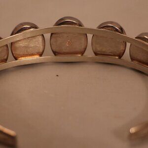 New and never worn, this bracelet has 5 cabochon lapis pieces in three sizes, with the largest in the center – it measures about ¾’ high and ½” wide to give you a sense of the others. Double silver bad around the perimeter with a 1” opening at the back. Weight: 18 grams/0.6 ounce. Stamped: 925. [Stock: P-561]