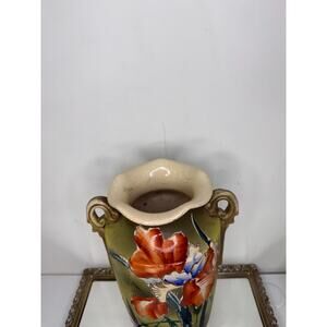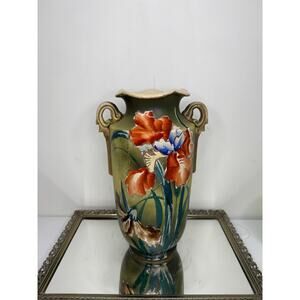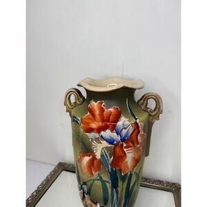 Stunning Large Antique Asian Handpainted Pottery Vase Ruffle Rim Handles Raised Gild Floral Vase