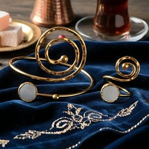 Discover the enchantment of Istanbul with our Handcrafted Turkish Jewelry Set! This exclusive collection, specially crafted by Istanbul's finest artisans, features a unique spiral design that wraps elegantly around your finger and wrist. Made of premium brass bijoux metal and lavishly coated in 18K gold, each piece epitomizes luxury and sophistication.
