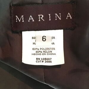 This striking peplum-style size 6 jacket by MARINA is brown taffeta with embroidery and sewn-in ribbons. Front fabric buttons and front and back darts. Like new!