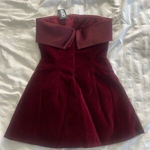 Keywords: Murci dress, strapless mini dress, velvet cocktail dress, burgundy holiday dress, satin neckline, party dress, wedding guest dress, structured mini, new with tags