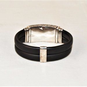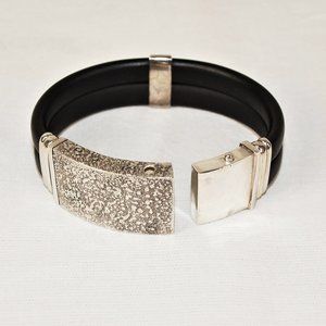 Modern, elegant, versatile and exceedingly comfortable to wear. This modernist bracelet This modern piece incorporates sterling silver and rubber and is made with high level handcraftsmanship, as seen in the "hammered" look of the center focal point. Stamped with “925” for sterling silver, no other markings. It measures approximately 7 1/2” x 5/8” x 7/8". Clasp is in excellent working condition and the piece shows very little wear. Perfect the the modern male or female! Please see photos.