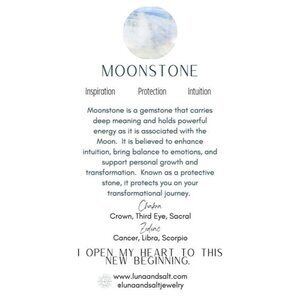Moonstone is a gemstone that carries deep meaning and holds powerful energy as it is associated with the Moon. It is believed to enhance intuition, bring balance to emotions, and support personal growth and transformation. Moonstone is also known to have protective properties, promote love and relationships, and aid in emotional healing. Moonstone is associated with the feminine energy and is said to be a stone of fertility, supporting reproductive health. A wonderful gift for yourself or a loved one!