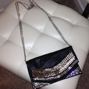 This clutch is to die for. Has silver chain straps inside if you would rather wear it as a handbag. Plenty of space too. Open as clutch and also open whole bag and fold over. Bought at a boutique in Vegas. PP lowers price.