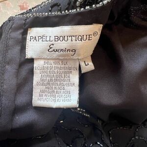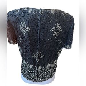 This stunning NWT Papell Boutique short sleeve beaded top is perfect for formal occasions like weddings and parties. The black top features a zip closure at the back, a round neckline, and shoulder pads for added elegance. Made from silk and polyester, this size large top exudes sophistication and style, making it a must-have addition to any woman's wardrobe. Perfect for those looking for a chic and versatile piece that can be dressed up or down for any event.