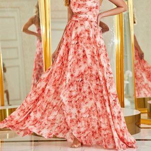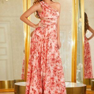 Stunning One Shoulder Cut Out Waist Split Thigh Floral Maxi Dress