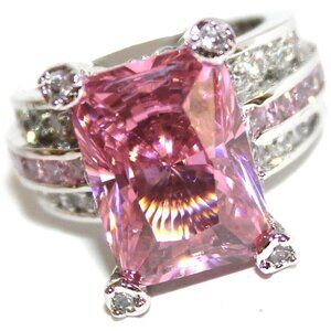 This Gorgeous ring features mini cz's in clear and pink surrounding this featured pink cz stone, held by 4 unique prongs.  **Please note** The pink color varies in different lighting. Flourescent lighting shows brighter pink, but home and outdoor lighting show pale pink.  The center stone measures 14x10 mm in size which makes the carat weight 8.47 for the center stone only.