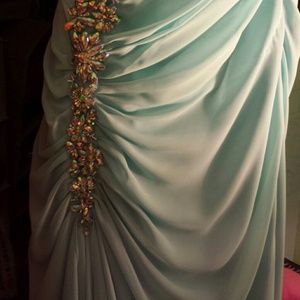 Light blue, fitting, stunning prom dress worn once! Was a size 10 but it has been taken in to an 8.