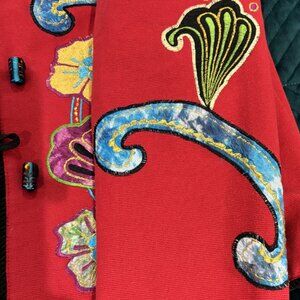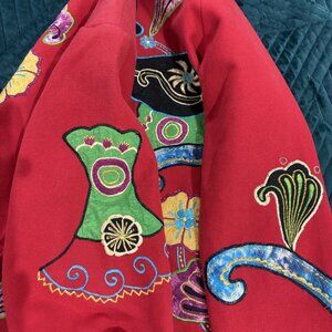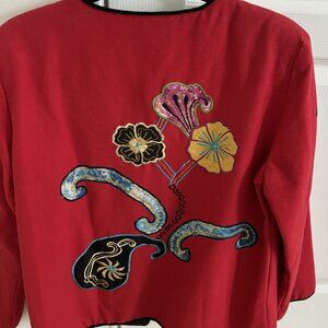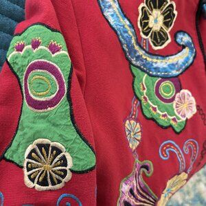 Turn heads in this vibrant, statement-making jacket! The rich red background is beautifully accented with bold, colorful embroidery and appliqué designs on both the front and back. A true wearable piece of art!