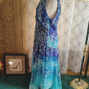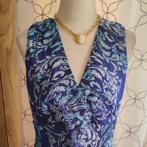 Sleeveless V-neck midi dress with a gathered bodice. Flowy skirt with a cascading paisley print. Lightweight, breezy fabric for easy wear. Stylish blue and aqua colorway that stands out.polyester dress