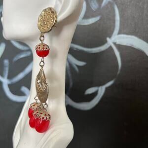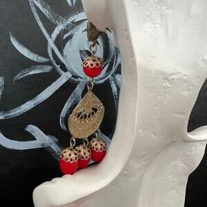this is THE single earring that's about to become your signature piece! This gorgeous bohemian beauty features intricate gold-tone filigree work that screams vintage luxury meets modern boho chic. The rich coral red beads are absolutely stunning - they'll pop against every skin tone and add that perfect splash of warmth to any outfit.
